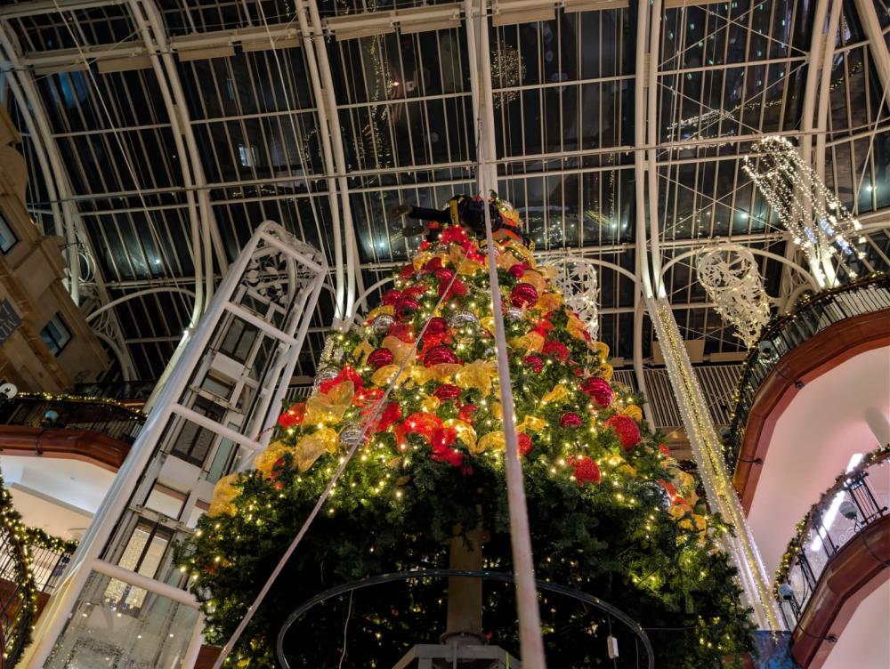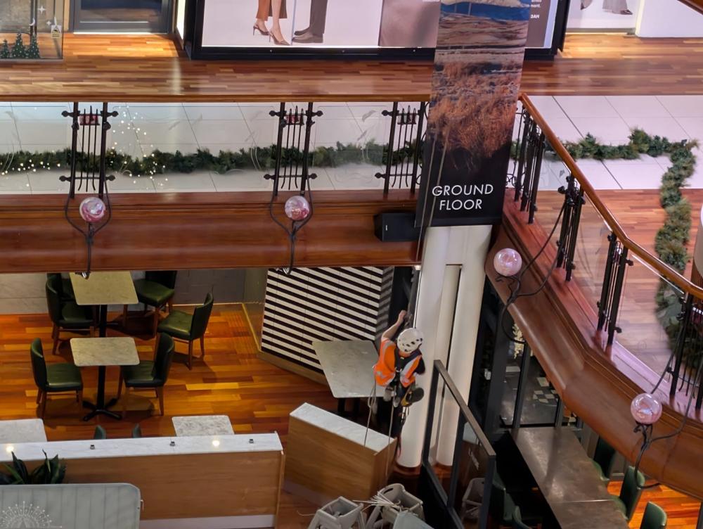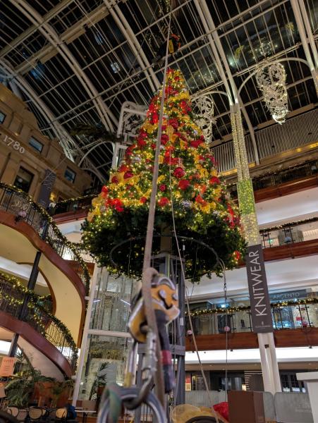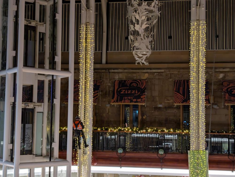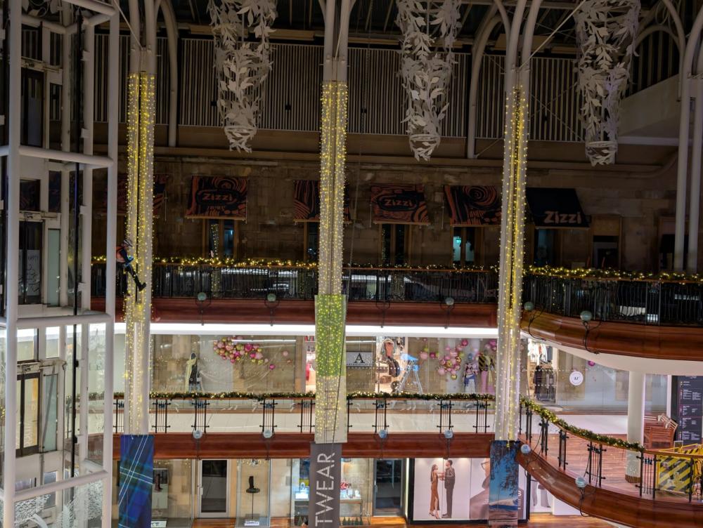 For the third consecutive year, AIM Rope Access has proudly delivered the spectacular installation of Christmas decorations at Princes Square, Glasgow. Working at height within the iconic atrium, our skilled rope access team carefully positioned lights, ornaments, and festive displays to transform the space into a winter wonderland. This project highlights not only our technical expertise and precision but also our ability to bring joy and atmosphere to one of Glasgow’s most loved shopping destinations. Each year, the decorations become a centerpiece of the city’s festive celebrations, and we’re delighted to play a part in creating that magic.