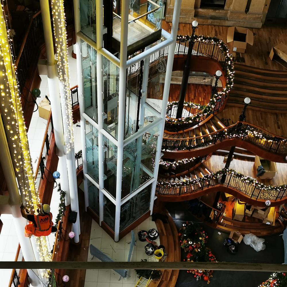 AIM is embracing the festive spirit with flair. Our expert rope access team is thrilled to be working with our new client, The Christmas Decorators, to bring the magic of Christmas to Princes Square Shopping Centre through the artful hanging of decorations and the construction of a massive 42-foot Christmas tree. Our team, renowned for their expertise in rope access in Glasgow, consists of highly trained professionals who specialise in advanced rope access techniques. Each member is certified and brings years of experience in building maintenance in Glasgow, ensuring that every project is executed with precision and safety. Equipped with the latest in rope access technology, our technicians guarantee a seamless and secure installation process. From twinkling lights cascading elegantly to whimsical ornaments dancing in the air, the decorations promise to enchant shoppers and create an unforgettable holiday atmosphere. Our commitment to excellence and attention to detail ensures that every element is perfectly placed, transforming Princes Square into a winter wonderland. Whether it's scaling great heights to position the star atop the tree or meticulously arranging each bauble, our teams dedication and passion shine through in every aspect of their work. With AIM, you can trust that the festive decorations will not only meet but exceed expectations, bringing joy and wonder to all who visit.